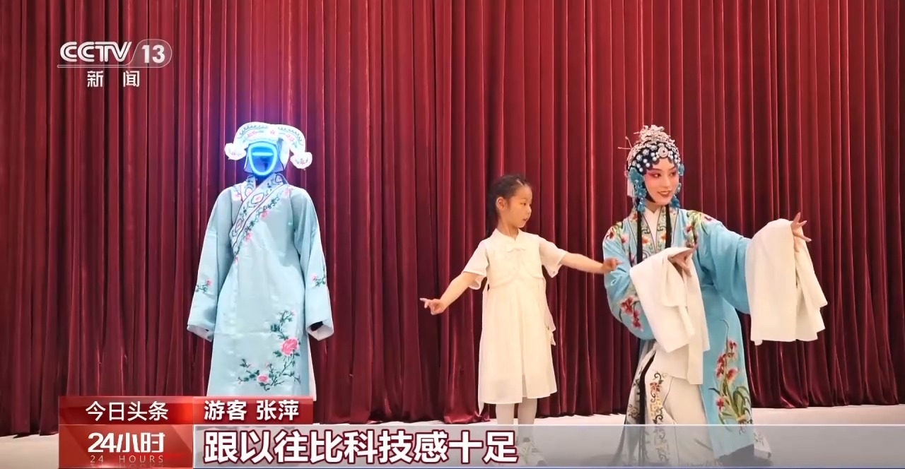 “五一”假期,江蘇鹽城建湖九龍口淮劇小鎮(zhèn)化身科技戲臺(tái),機(jī)器人演員與梨園名家同臺(tái)獻(xiàn)藝、默契共舞。