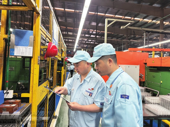 曾明軍(左)和同事一起查看生產(chǎn)情況