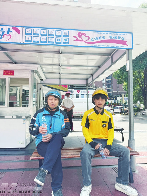 奧林春天小區(qū)則為騎手們設(shè)置了休憩涼棚。記者前往采訪時(shí),兩名騎手正坐在凳子上喝水,一旁,保安師傅搬來的電風(fēng)扇送來徐徐涼風(fēng)。“不但有水喝,還提供藿香正氣液、碘伏,都很實(shí)用。”騎手小諶說。