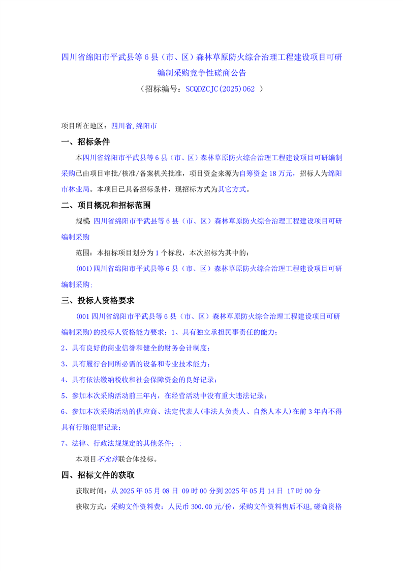 四川省綿陽(yáng)市平武縣等6縣(市、區(qū))森林草原防火綜合治理工程建設(shè)項(xiàng)目可研編制采購(gòu)競(jìng)爭(zhēng)性磋商公告