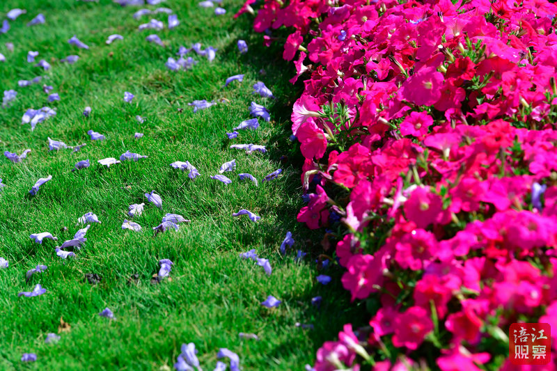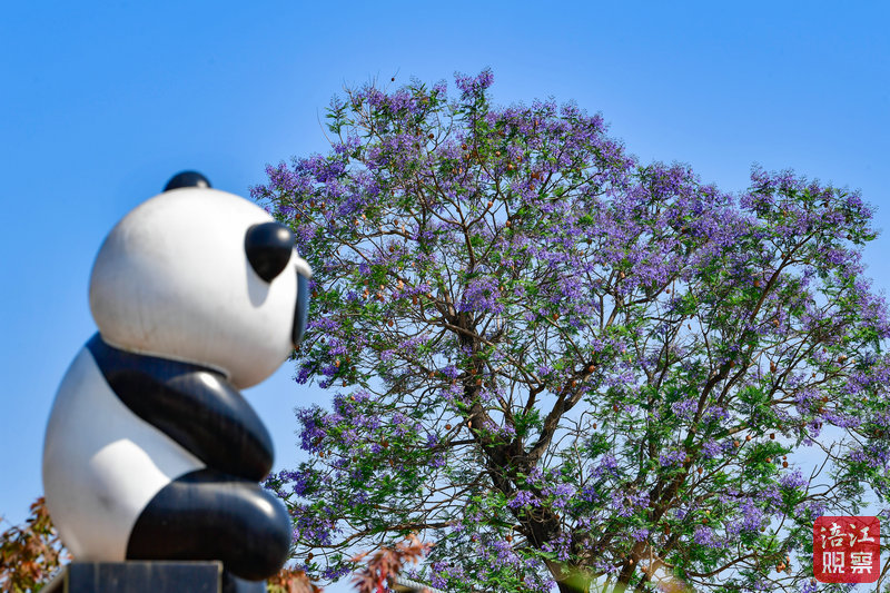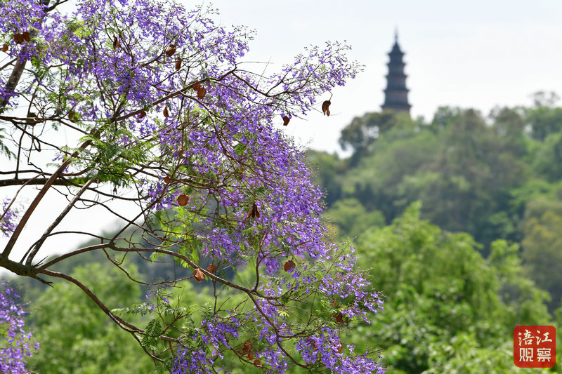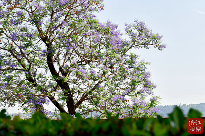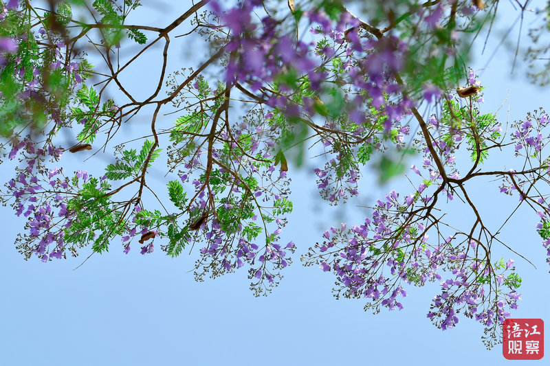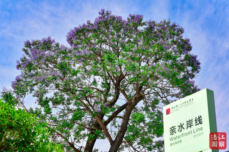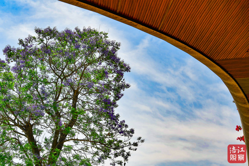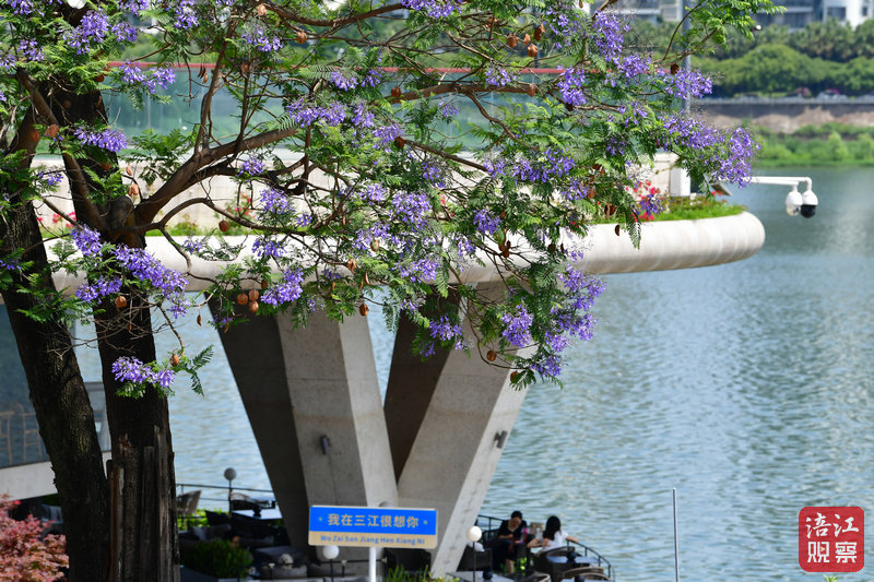 在湖畔,兩棵高大粗壯的藍花楹樹正值開放期,一朵朵藍紫色的花朵簇擁在枝頭,為這座城市增添了一抹浪漫而迷人的色彩。