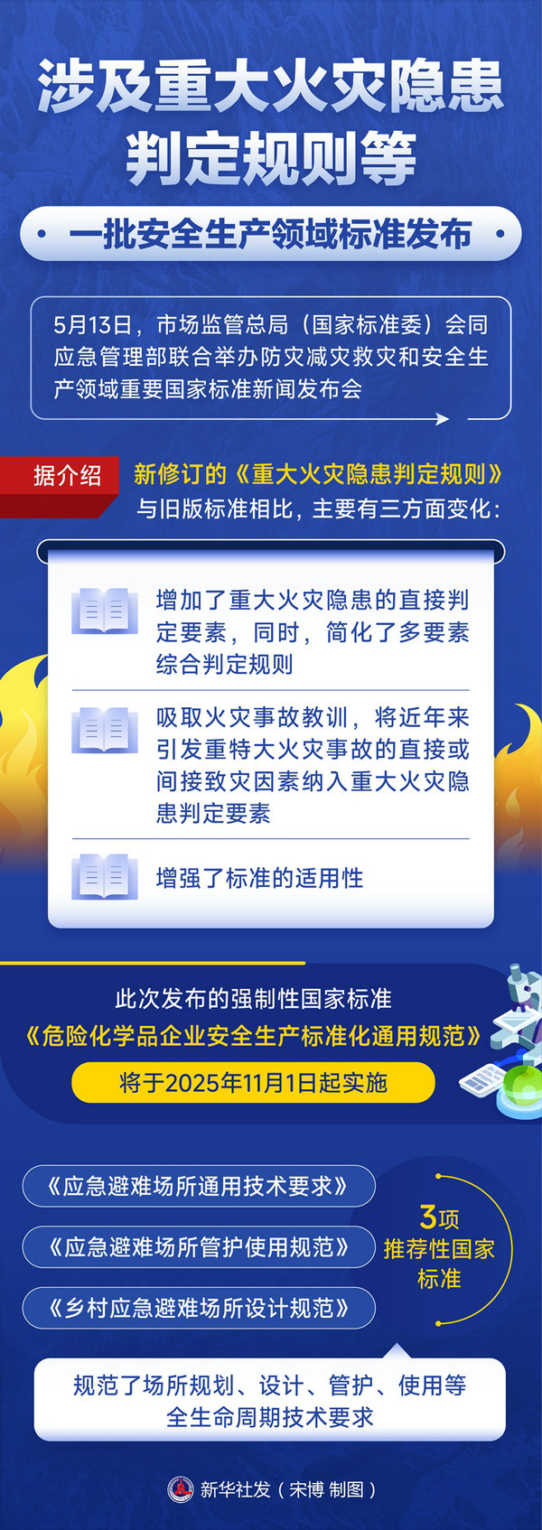 新華社北京5月13日電 題:涉及重大火災(zāi)隱患判定規(guī)則等 一批安全生產(chǎn)領(lǐng)域標(biāo)準(zhǔn)發(fā)布