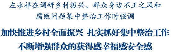綿陽新聞網(wǎng)訊 5月14日,副省長、市委書記左永祥前往安州區(qū)、江油市調(diào)研鄉(xiāng)村振興、群眾身邊不正之風(fēng)和腐敗問題集中整治工作。他強(qiáng)調(diào),要深入學(xué)習(xí)貫徹習(xí)近平總書記關(guān)于黨的自我革命的重要思想、關(guān)于“三農(nóng)”工作的重要論述,全面落實(shí)黨中央和省委部署要求,堅(jiān)持以人民為中心的發(fā)展思想,加快推進(jìn)鄉(xiāng)村全面振興,扎實(shí)抓好集中整治工作,以實(shí)際成效不斷增強(qiáng)群眾的獲得感、幸福感、安全感。