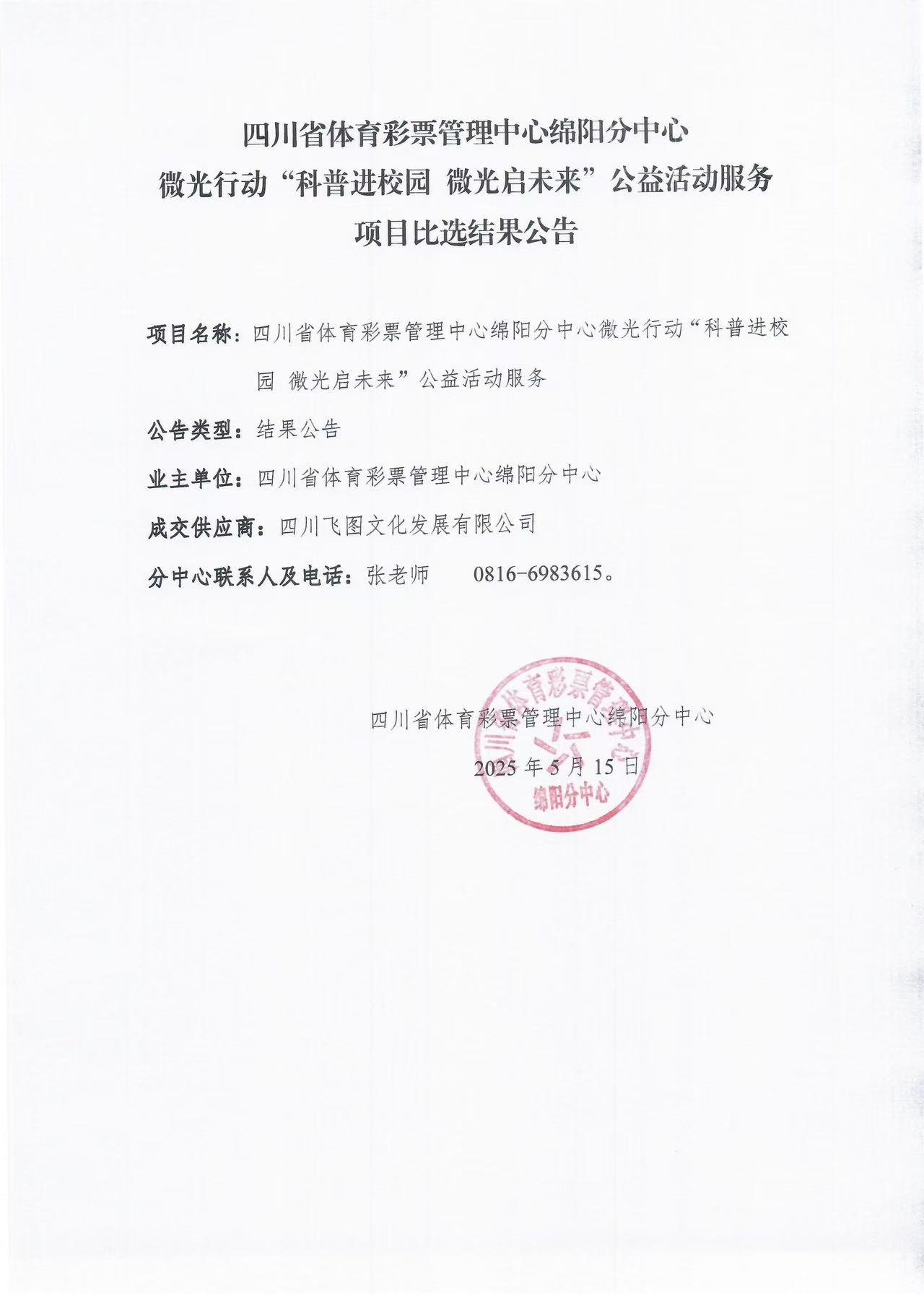 四川省體育彩票管理中心綿陽分中心微光行動“科普進(jìn)校園微光啟未來”公益活動服務(wù)項(xiàng)目比選結(jié)果公告