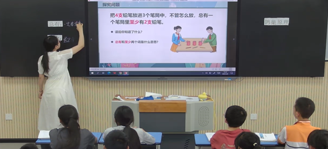 課堂上,羅亞鑫老師從生活中的現(xiàn)象入手,用4支鉛筆和3個筆筒,通過讓學(xué)生擺一擺,畫一畫,寫一寫等教學(xué)方法引導(dǎo)學(xué)生理解“總有”“至少”。通過自主探究學(xué)生們讓學(xué)生積極參與課堂互動,運(yùn)用枚舉法和假設(shè)法讓學(xué)生進(jìn)一步理解鴿巢原理,在思考與討論中不斷探索知識的奧秘。
