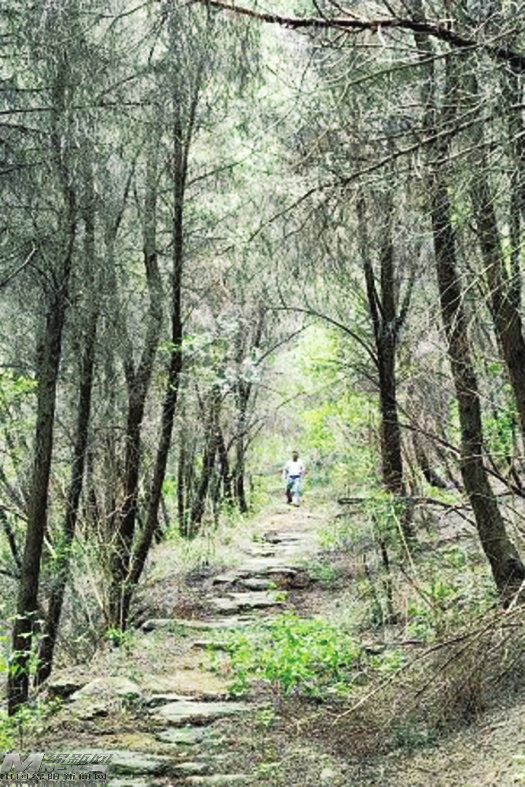 時(shí)值初夏,山林間時(shí)不時(shí)有涼風(fēng)吹過,偶爾也有鳥鳴傳來。小路沿山勢向前蔓延,最初只能看到純粹的泥土路面,沿途林木蔥郁,前行約400米左右,路面上出現(xiàn)了零星的石板。