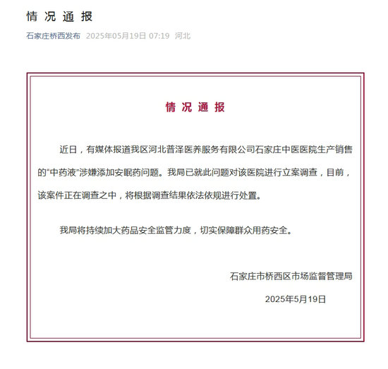 近日,有媒體報(bào)道橋西區(qū)河北普澤醫(yī)養(yǎng)服務(wù)有限公司石家莊中醫(yī)醫(yī)院生產(chǎn)銷售的“中藥液”涉嫌添加安眠藥問題。石家莊市橋西區(qū)市場監(jiān)督管理局已就此問題對該醫(yī)院進(jìn)行立案調(diào)查,目前,該案件正在調(diào)查之中,將根據(jù)調(diào)查結(jié)果依法依規(guī)進(jìn)行處置。