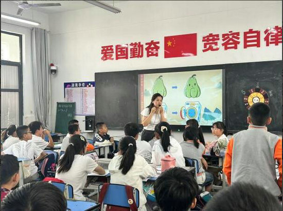 音樂教師譚力文執(zhí)教的《黃葛樹下》以四川童謠為切入點,通過節(jié)奏創(chuàng)編與多聲部合唱,引導(dǎo)學生感悟音樂魅力。譚老師吉他、口風琴、鋼琴、雙響筒等樂器的展示,充分體現(xiàn)出過硬的專業(yè)水平。拓展環(huán)節(jié)中,體育元素跳皮筋的融入,提升了學生的學習興趣,真正做到了在玩中學,在學中樂。