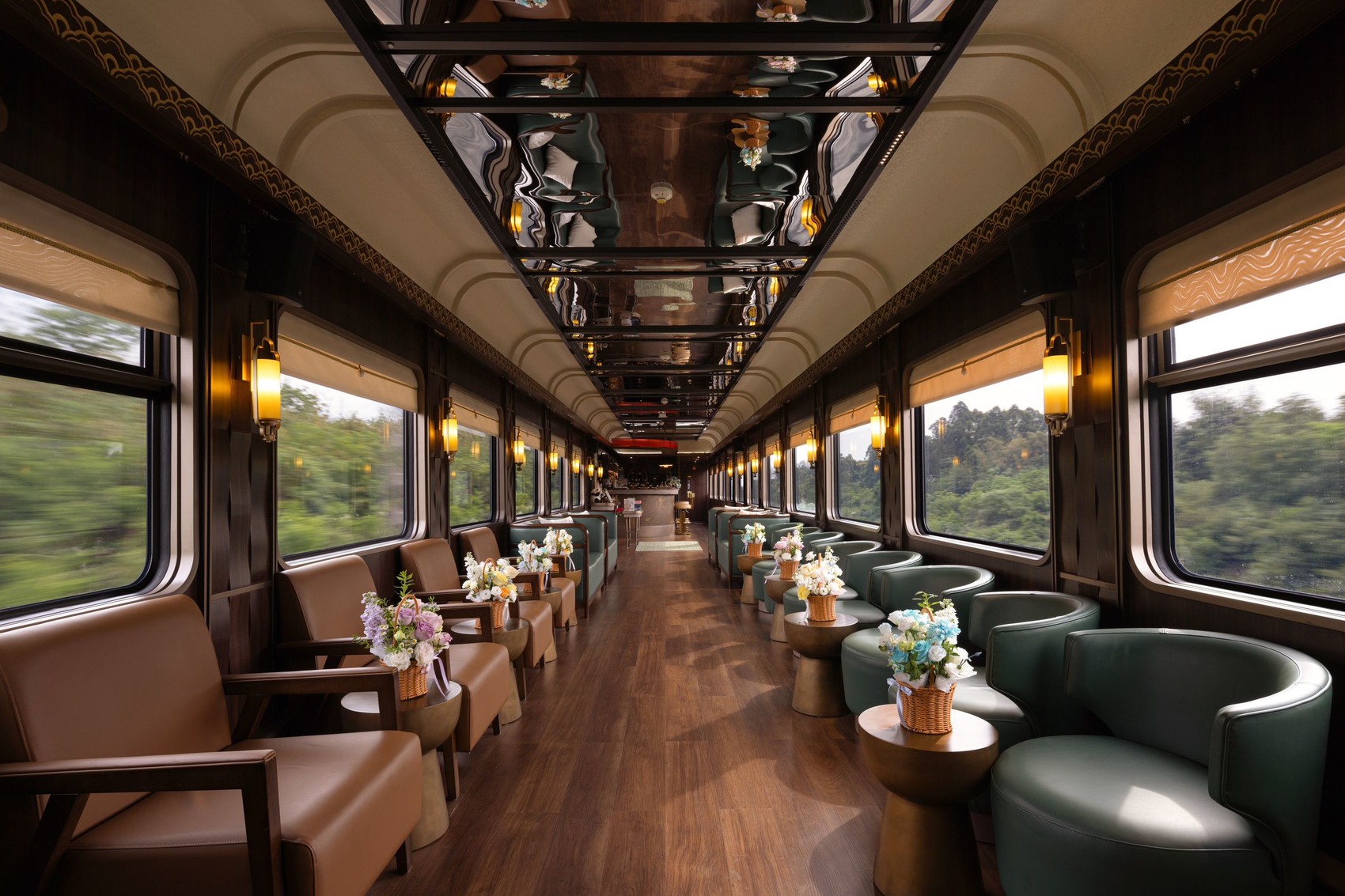 記者現(xiàn)場看到,“熊貓專列·成都號(hào)”由綠皮車改造而成,配備54個(gè)包房,含標(biāo)間和大床房。每個(gè)包房內(nèi)配有干濕分離衛(wèi)浴、智能語音控制系統(tǒng),連窗戶都比普通列車寬30厘米;公共區(qū)域配有餐廳、KTV、酒吧、茶室、麻將桌、按摩椅、兒童游戲區(qū)等,如同一艘軌道上的豪華游輪。
