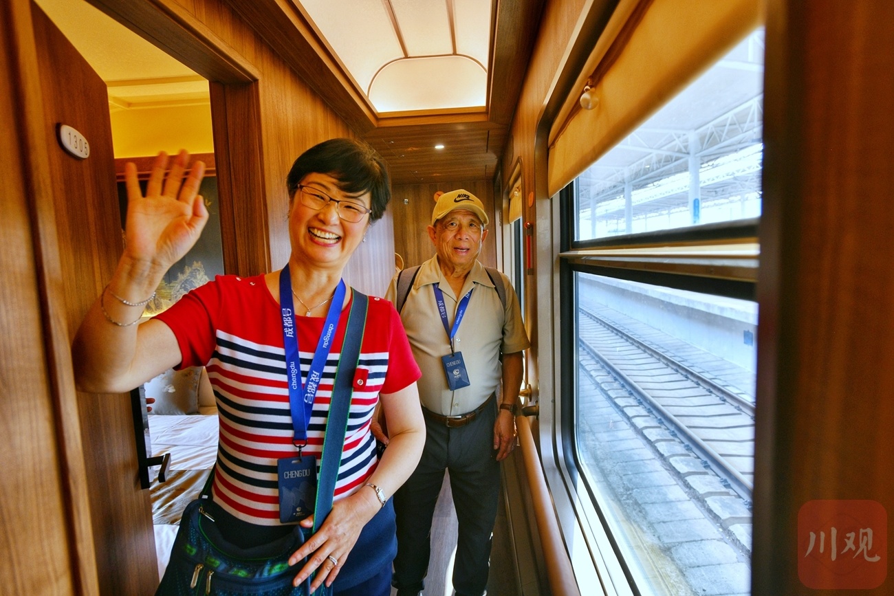 “成都號(hào)”旅客約首發(fā)游客共109人,主要來自美國、加拿大、日本、菲律賓等國家以及我國北京、上海、福建、四川、香港、臺(tái)灣等地,其中境外游客65人,占比59.6%;50歲以上乘客占比達(dá)到80%。既是“國際范”專列,也是“銀發(fā)”專列。從此前預(yù)售情況來看,今年10個(gè)團(tuán)期中,境外游客約占70%,中老年游客占比也較高。
