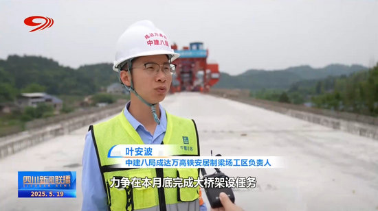 中建八局成達萬高鐵安居制梁場工區(qū)負責(zé)人 葉安波:力爭在本月底完成大橋架設(shè)任務(wù),為后續(xù)施工奠定基礎(chǔ)。整個項目建成投用后,將形成成都直達中原和京津冀地區(qū)的便捷客運通道。