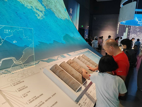 18日,觀眾在玉架山考古博物館臨平遺址群廳里觀察不同類型的巖芯。新華社記者 馮源 攝