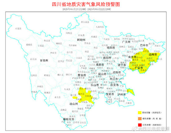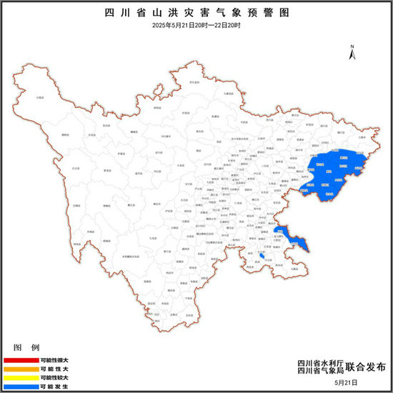 2025年5月21日20時至22日20時,瀘州市瀘縣、合江,南充市營山、蓬安、儀隴,宜賓市長寧,廣安市廣安、前鋒、岳池、武勝、鄰水、華鎣,達州市通川、達川、宣漢、開江、大竹、渠縣,巴中市平昌19個縣(市、區(qū))可能發(fā)生山洪災(zāi)害。