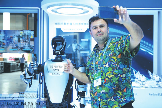 在綿陽展館機器人產(chǎn)業(yè)展區(qū),外國觀眾與樂聚機器人拍照留念。