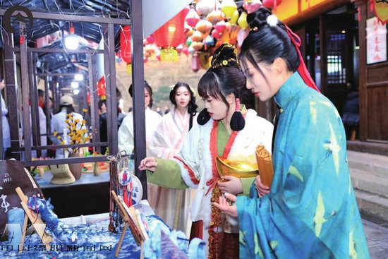 徜徉在潼川古城,民樂奏響千年梓州韻律,古韻巡游重現(xiàn)盛唐氣象;李白與杜甫“斗詩擂臺”吸引游客即興對詩,詩詞聲韻回蕩古城街巷;多項非遺技藝通過創(chuàng)意花車市集與游客零距離互動,指尖匠心與市井煙火交織成流動的文化長卷,帶領(lǐng)游客沉浸式體驗文旅之趣。