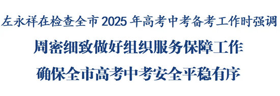 檢查中,左永祥強(qiáng)調(diào),高考中考牽動(dòng)千家萬(wàn)戶、事關(guān)萬(wàn)千學(xué)子,是全社會(huì)高度關(guān)注的大事。各地各有關(guān)部門(mén)要進(jìn)一步提高政治站位,全鏈條抓好考前考中考后各項(xiàng)工作,高標(biāo)準(zhǔn)嚴(yán)要求對(duì)各個(gè)環(huán)節(jié)進(jìn)行再檢查、再完善,以扎實(shí)有力的工作成效讓考生舒心、家長(zhǎng)安心、社會(huì)放心。要守牢安全底線,全面落實(shí)國(guó)家教育考試安全保密規(guī)定和考務(wù)管理要求,加強(qiáng)演練培訓(xùn)、強(qiáng)化技術(shù)賦能,精心做好考試組織、考試環(huán)境治理、考風(fēng)考紀(jì)建設(shè)等各項(xiàng)工作,全力防范失泄密、高科技舞弊等風(fēng)險(xiǎn)。要強(qiáng)化服務(wù)保障,用心用情做好食品安全、醫(yī)療保障工作,統(tǒng)籌抓好交通疏導(dǎo)、治安管理、噪聲治理、消防安全等工作,加強(qiáng)值班值守和應(yīng)急準(zhǔn)備,盡最大努力為考生順利應(yīng)考創(chuàng)造良好條件。要扎實(shí)做好考后各項(xiàng)工作,強(qiáng)化后續(xù)閱卷、志愿填報(bào)、招生錄取等各環(huán)節(jié)管理,優(yōu)化考后線上線下咨詢服務(wù),積極組織開(kāi)展招錄政策解讀和信息支持,有效回應(yīng)社會(huì)關(guān)切,讓考生更好圓夢(mèng)未來(lái)。