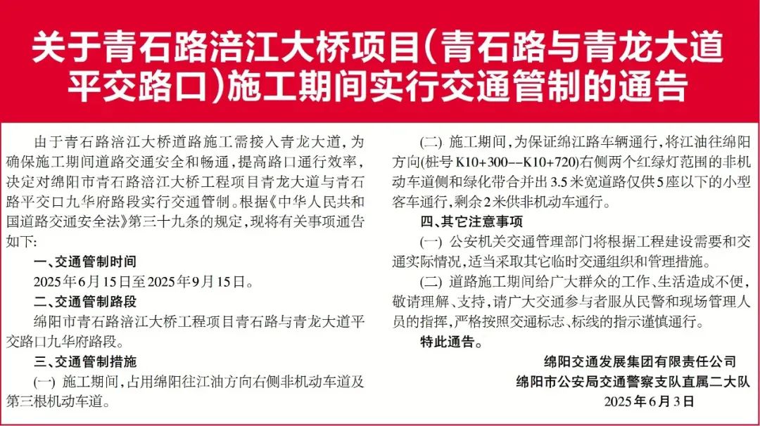 由于青石路涪江大橋道路施工需接入青龍大道,為確保施工期間道路交通安全和暢通,提高路口通行效率,決定對綿陽市青石路涪江大橋工程項目青龍大道與青石路平交口九華府路段實行交通管制。根據(jù)《中華人民共和國道路交通安全法》第三十九條的規(guī)定,現(xiàn)將有關事項通告如下: