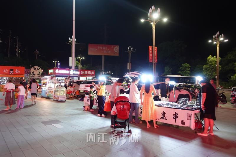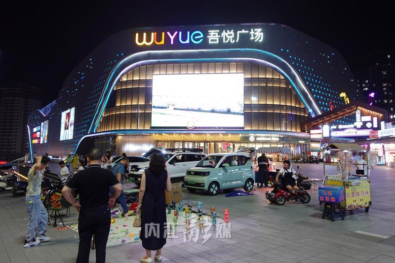 在吾悅廣場門前,幾輛新能源汽車打開后備箱,變身成為臨時(shí)攤位,售賣手工串珠飾品;三元匯的大排檔里,服務(wù)員端著紅彤彤的龍蝦穿梭于餐桌之間;石羊大道上,騎行愛好者們?nèi)齼蓛山Y(jié)伴而行——這是2025年夏季,內(nèi)江城南新區(qū)夜晚的日常畫面。