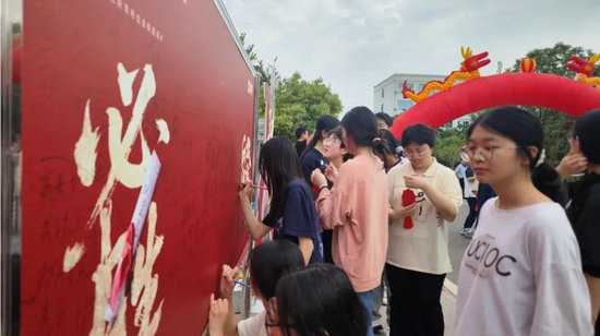 高考前夜,食堂周邊早已被精心布置成溫暖的“加油站”。一座寫有 “答卷繪未來,拼搏無遺憾” 的溫馨拱門立于入口,仿佛一道通往夢想的“凱旋門”,多版面的簽名墻靜靜佇立在旁邊,等待著學子們揮筆留下青春誓言與同窗印記。寓意十足的 “考神附體” 打卡拍照點,更是吸引了眾多學子駐足,鏡頭下定格的笑臉,是緊張備考中難得的輕松一刻。