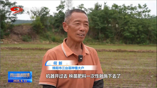 綿陽市三臺縣種植大戶 何新:機(jī)器開過去,秧苗肥料一次性就施下去了,省力省人工,它的秧苗返青快,比手插秧提早3天返青。