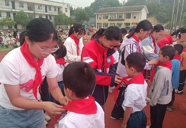 活動在莊嚴的升旗儀式中拉開序幕,43名一年級新生光榮加入少先隊,佩戴上鮮艷的紅領(lǐng)巾,在隊旗下莊嚴宣誓。