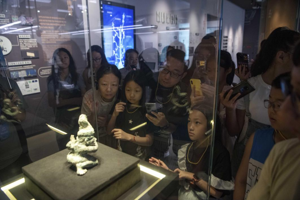 在三星堆博物館文物保護(hù)與修復(fù)館,游客在“匠心妙手——三星堆遺址新出土文物保護(hù)修復(fù)成果展示”試開放期參觀。新華社記者唐文豪攝