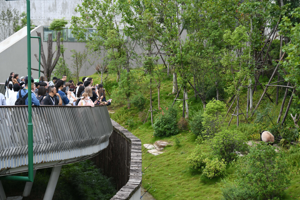 參與金熊貓獎的中外嘉賓走進(jìn)成都大熊貓繁育研究基地近距離觀看大熊貓。新華社記者胥冰潔攝