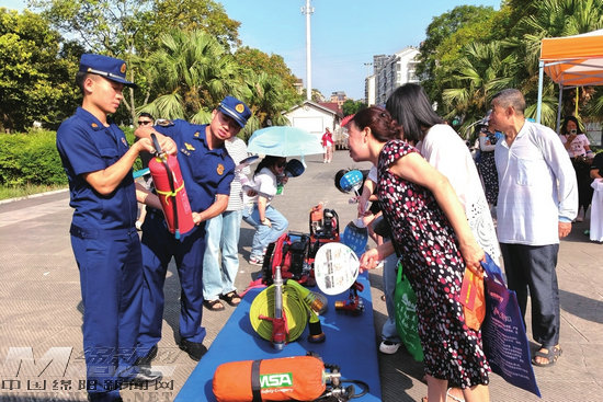 游仙區(qū)活動現(xiàn)場,工作人員講解消防器材使用技能。
