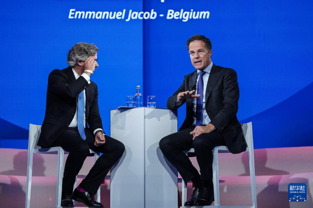 6月24日,在荷蘭海牙,北約秘書(shū)長(zhǎng)呂特(右)在北約公共論壇上講話(huà)。新華社記者 彭子洋 攝