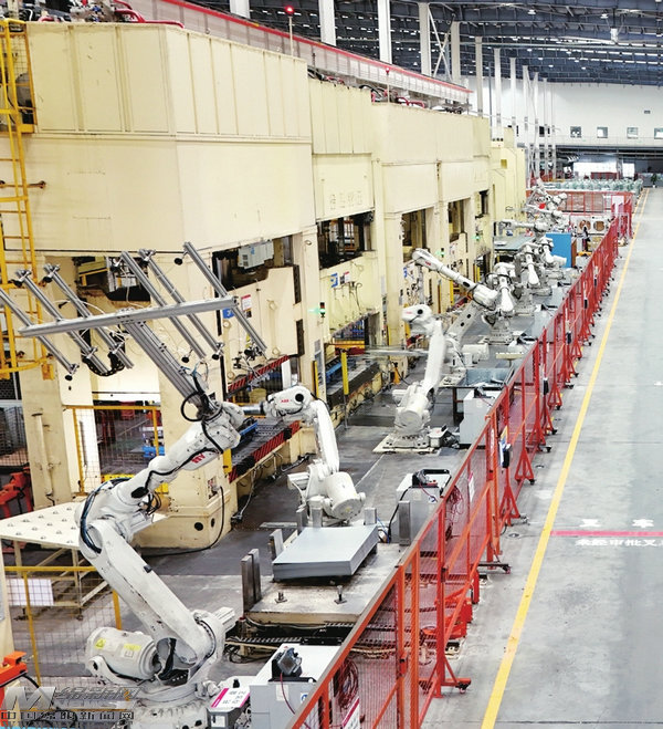 長虹技佳自動化沖壓生產(chǎn)線上,機器人手臂靈活作業(yè)。
