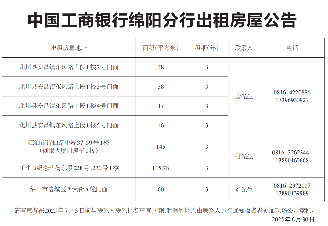 中國(guó)工商銀行綿陽(yáng)分行出租房屋公告