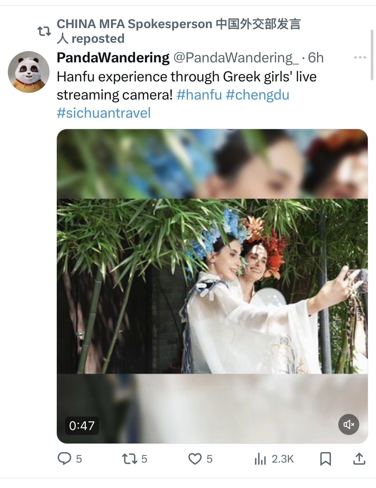近日,中國外交部發(fā)言人賬號(hào)在X(原推特)上連續(xù)轉(zhuǎn)發(fā)兩條與四川相關(guān)的國際互動(dòng)動(dòng)態(tài)。