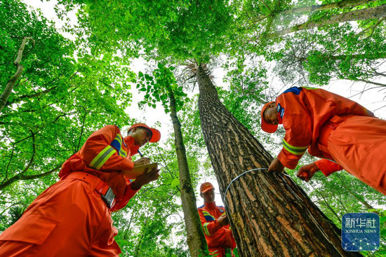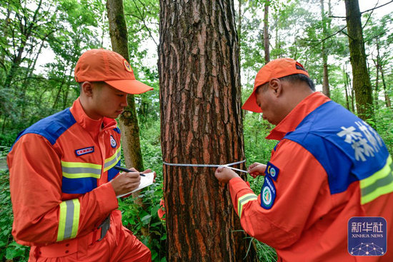 ↑7月1日,護(hù)林員在貴陽市長坡嶺國有林場測量樹干。