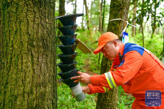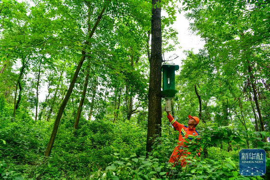 ↑7月1日,護(hù)林員在貴陽市長坡嶺國有林場查看病蟲害防治誘捕器監(jiān)測情況。