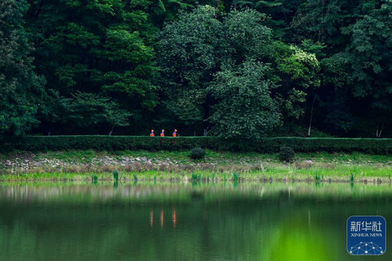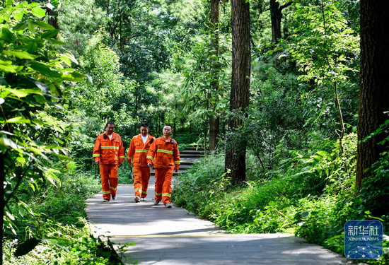 ↑護(hù)林員在貴陽市長坡嶺國有林場巡護(hù)山林(2022年7月13日攝)。