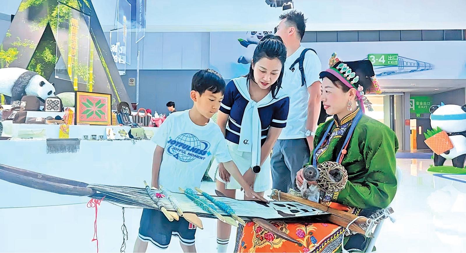能卡曼(右一)在西博會上設(shè)置嘉絨藏族的織布機展示手工工藝
