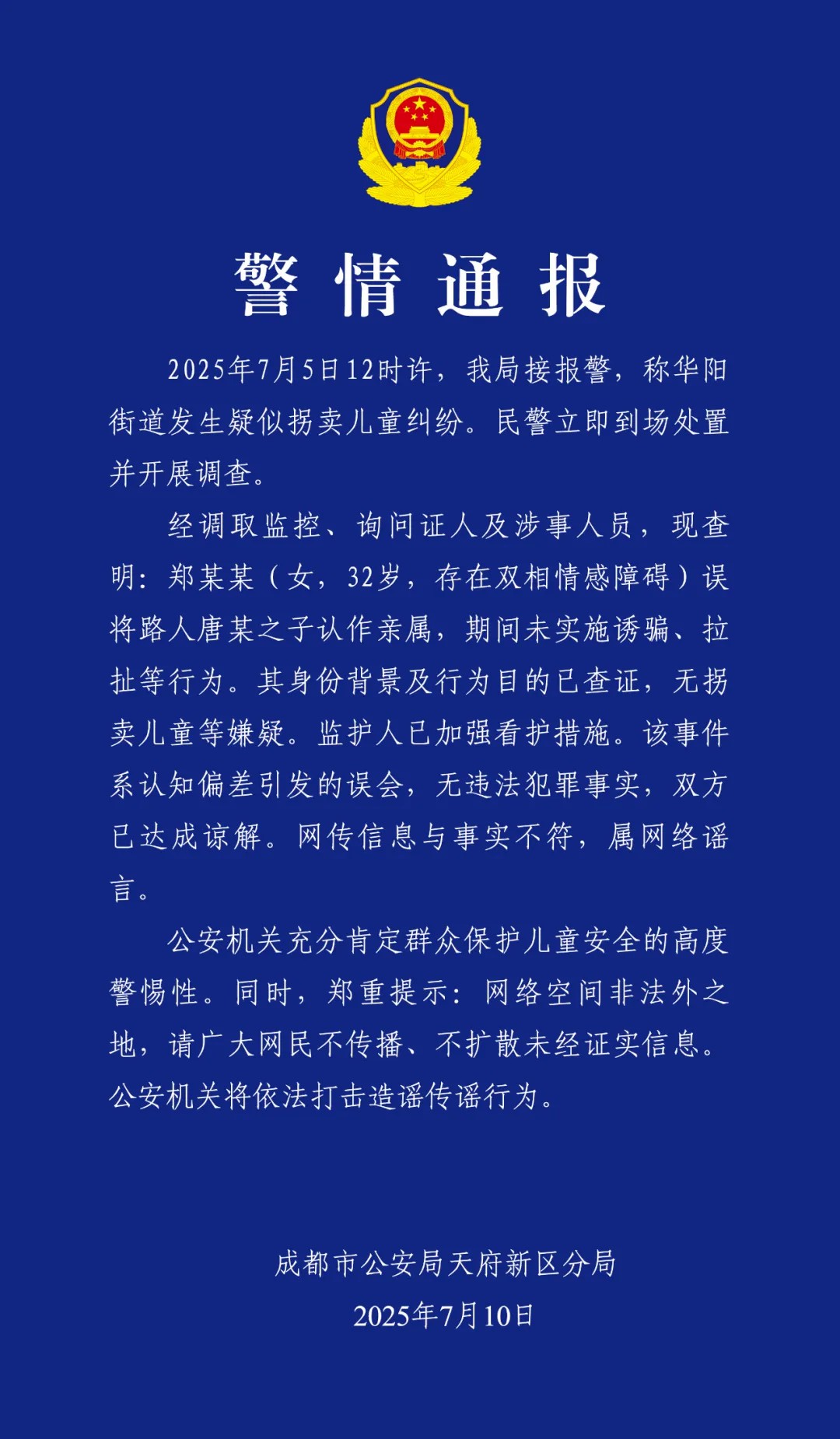 據(jù)“成都天府公安”微信公眾號消息,成都市公安局天府新區(qū)分局發(fā)布警情通報稱,2025年7月5日12時許,成都市公安局天府新區(qū)分局接報警,稱華陽街道發(fā)生疑似拐賣兒童糾紛。民警立即到場處置并開展調(diào)查。