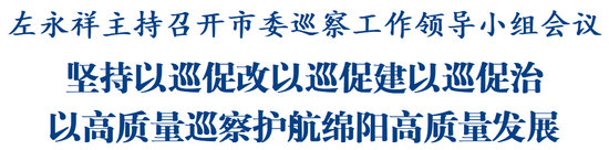 綿陽(yáng)新聞網(wǎng)訊 7月10日,市委巡察工作領(lǐng)導(dǎo)小組第九次會(huì)議召開(kāi),省委常委、副省長(zhǎng)、市委書(shū)記左永祥主持會(huì)議并講話。他強(qiáng)調(diào),要深入學(xué)習(xí)貫徹習(xí)近平總書(shū)記關(guān)于巡視工作重要論述,全面落實(shí)黨中央決策部署和省委工作要求,堅(jiān)持以巡促改、以巡促建、以巡促治,抓好問(wèn)題整改,強(qiáng)化成果運(yùn)用,推動(dòng)巡察工作向縱深發(fā)展,以高質(zhì)量巡察護(hù)航綿陽(yáng)高質(zhì)量發(fā)展。
