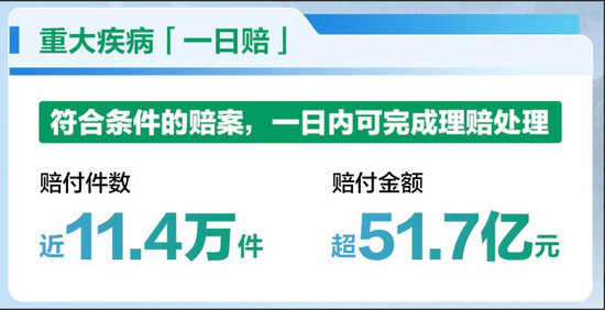 此外,該公司持續(xù)推動(dòng)“重疾一日賠”服務(wù),為更多客戶更快地送去保險(xiǎn)關(guān)愛。目前,“重疾一日賠”服務(wù)覆蓋了重疾賠付中占比最高的惡性腫瘤和部分心腦血管疾病。符合條件的賠案,一日內(nèi)可完成理賠處理。2025年上半年,“重疾一日賠”賠付件數(shù)近11.4萬件,賠付金額超51.7億元。