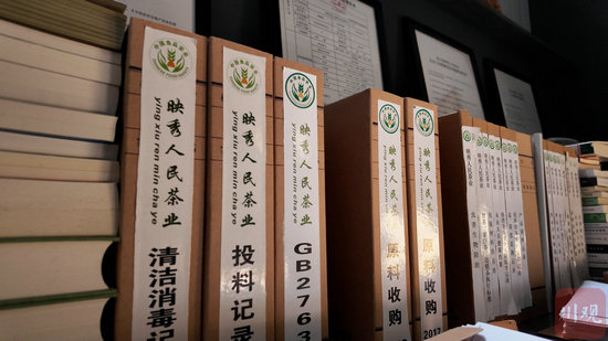 在一樓到二樓的樓梯拐角處,蔣維明打開一排文件袋,里面詳細(xì)記錄著售茶農(nóng)民的姓名、時間、重量等信息。“精益求精,就是要做到質(zhì)量可追溯。”