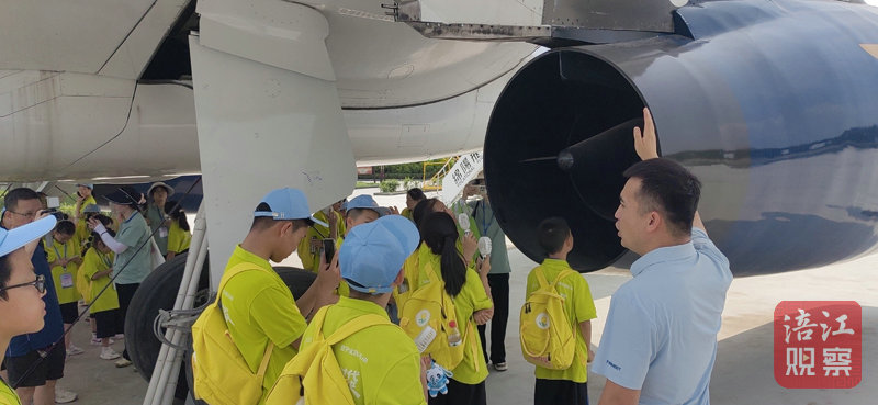 緊接著,少年們在老師的帶領(lǐng)下,近距離接觸“真飛機(jī)”。現(xiàn)場互動(dòng)氣氛熱烈,老師提出的關(guān)于飛機(jī)構(gòu)造的問題,如“飛機(jī)輪胎是空心的還是實(shí)心的”“飛機(jī)窗戶為什么是橢圓的”,引發(fā)了少年們的踴躍思考和回答。
