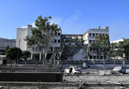 這是7月16日在敘利亞首都大馬士革拍攝的在以色列空襲中受損的敘“總參謀部”大樓。新華社發(fā)(阿馬爾·薩法爾賈拉尼攝)