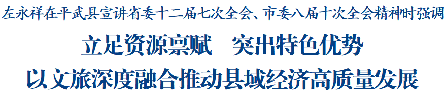 學(xué)習(xí)宣傳貫徹省委十二屆七次全會、市委八屆十次全會精神,是全市上下當前和今后一個時期的重要政治任務(wù)。左永祥認真聽取平武縣推動文旅深度融合發(fā)展情況介紹,并宣講省委十二屆七次全會、市委八屆十次全會精神。他說,推進文化和旅游深度融合發(fā)展,對于增強文化自信、服務(wù)人民群眾美好生活、促進高質(zhì)量發(fā)展具有重大意義。平武縣生態(tài)環(huán)境優(yōu)美、文旅資源富集,推進文旅融合發(fā)展有基礎(chǔ)、有條件、有潛力。要把省委、市委全會各項部署要求轉(zhuǎn)化為實實在在的舉措,把推進文化和旅游深度融合發(fā)展擺在更加突出的位置,進一步增強緊迫感,搶抓發(fā)展機遇、持續(xù)對標補短,用好優(yōu)質(zhì)自然生態(tài)資源和特色優(yōu)勢資源,找準定位、理清思路,走好差異化發(fā)展路子,扎實推進重點文旅項目建設(shè),優(yōu)化“吃住行游購娛”一站式服務(wù),加快把文化旅游業(yè)打造成為支柱產(chǎn)業(yè)、民生產(chǎn)業(yè)、幸福產(chǎn)業(yè)。要把學(xué)習(xí)貫徹省委、市委全會精神與做好當前工作結(jié)合起來,統(tǒng)籌做好抓項目、擴投資、促消費、惠民生、保安全等重點工作,堅定不移實現(xiàn)全年經(jīng)濟社會發(fā)展目標,為全市發(fā)展大局作出應(yīng)有貢獻。