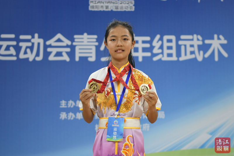 來自綿陽中學英才學校的小選手陶悅瑞今年12歲,此次比賽獲得直屬學校小學女子甲組傳統(tǒng)拳、傳統(tǒng)器械2枚金牌。