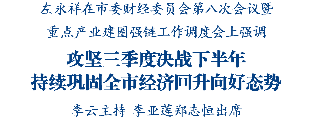 7月24日,市委財經(jīng)委員會第八次會議暨重點產(chǎn)業(yè)建圈強鏈工作調(diào)度會召開,省委常委、副省長、市委書記左永祥出席會議并講話。他強調(diào),要深入學(xué)習(xí)貫徹習(xí)近平總書記對四川工作系列重要指示精神,全面落實黨中央和省委關(guān)于做好經(jīng)濟工作的決策部署,保持定力、堅定信心,攻堅三季度、決戰(zhàn)下半年,持續(xù)鞏固全市經(jīng)濟回升向好態(tài)勢,為全省發(fā)展大局貢獻更多綿陽力量。