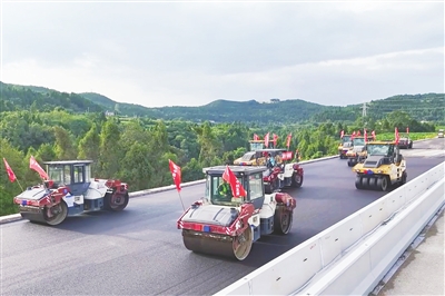 7月25日,記者走進廣綿擴容梓潼段施工現(xiàn)場看到,隨著攤鋪機履帶的快速轉(zhuǎn)動,原本粗糙的路基被迅速覆蓋上一層平整的瀝青。緊隨其后的壓路機來回碾壓,將松散的瀝青層壓實平整,輪跡所過之處,路面變得光滑而堅實。