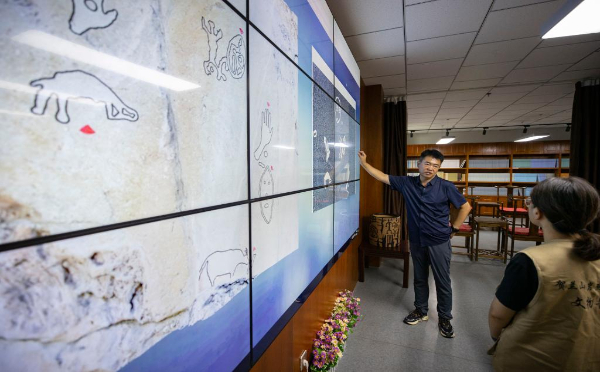 7月23日,工作人員在銀川世界巖畫(huà)館研究室研究賀蘭山巖畫(huà)數(shù)字拓片。