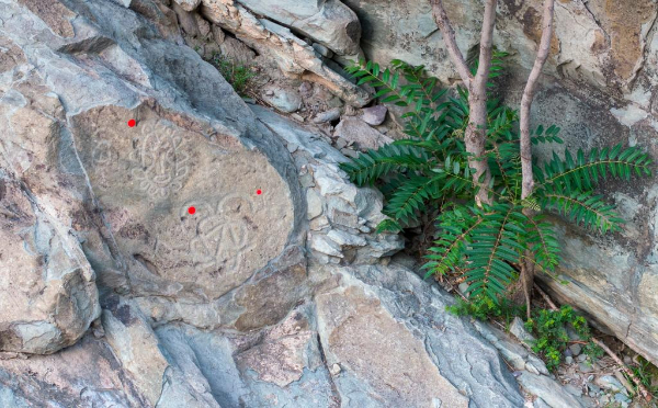 這是7月23日在賀蘭山巖畫(huà)景區(qū)拍攝的巖畫(huà)和紅色標(biāo)識(shí)點(diǎn)(無(wú)人機(jī)照片)。標(biāo)識(shí)點(diǎn)方便游客找到巖畫(huà),可以隨時(shí)粘貼,對(duì)石質(zhì)和文物不會(huì)產(chǎn)生影響。