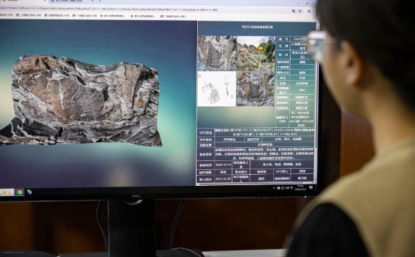 這是7月23日拍攝的賀蘭山巖畫(huà)多源數(shù)據(jù)管理平臺(tái)。工作人員將賀蘭口的形態(tài)和其中的巖畫(huà)進(jìn)行高精度掃描和建模,通過(guò)電腦便可查看賀蘭口的整體情況和個(gè)體巖畫(huà)樣貌。