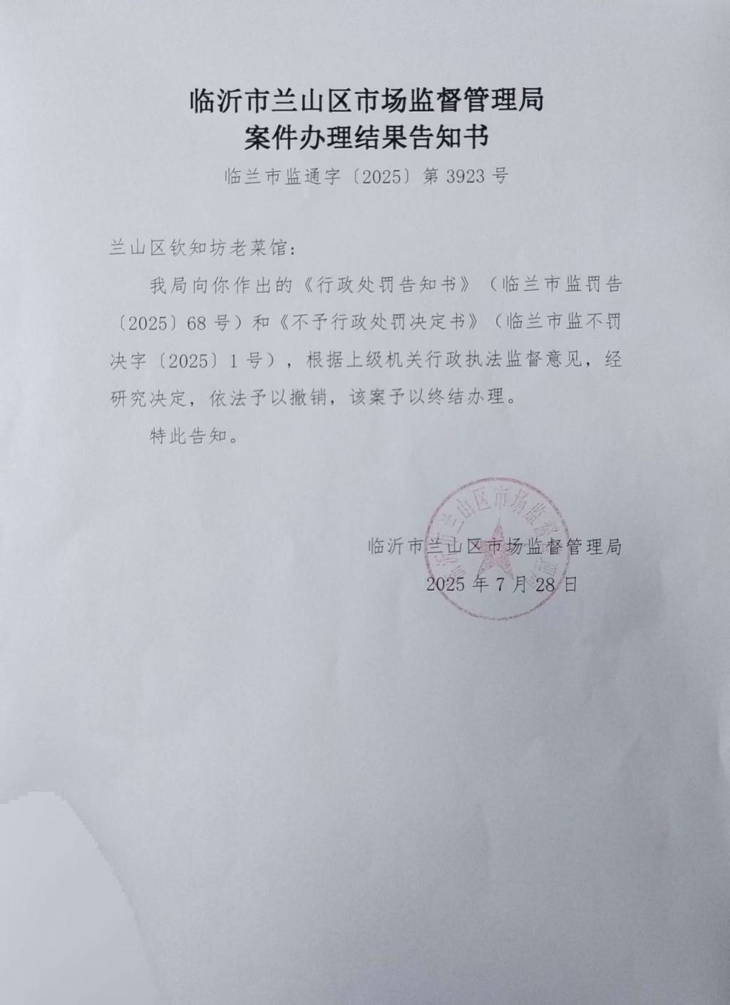 龔華表示,此次送達的《案件辦理結(jié)果告知書》,正式撤銷原執(zhí)法行為,意味著市監(jiān)局承認原執(zhí)法存在根本性錯誤,“撤銷案件不同于單純不予處罰,明確否定了飯店存在違法行為,凸顯程序正義在行政執(zhí)法中的重要性。”